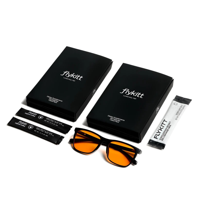 Jet lag isn’t just about sleep, and Flykitt knows that. They address both sides of the equation: circadian rhythm and the biological stress of flying.
